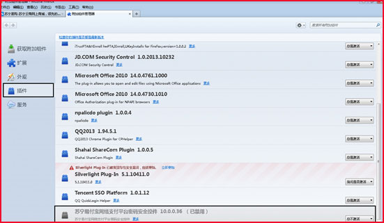 2)在【附加组件】浮层中点击【插件】,并在插件列表中找到【苏宁易付宝网络支付平台密码安全控件…】